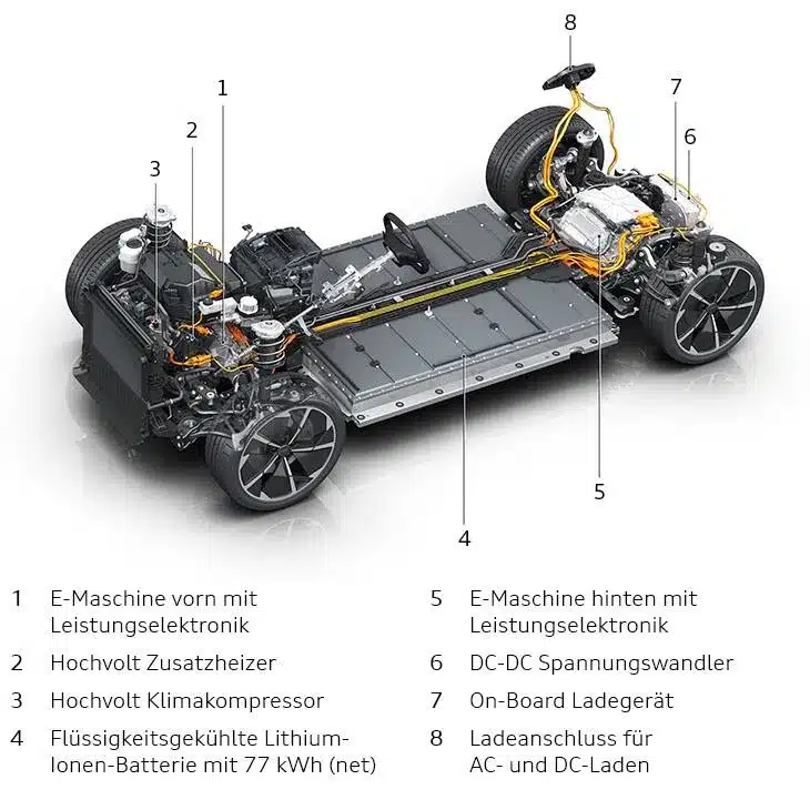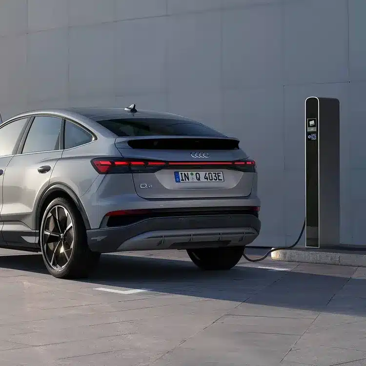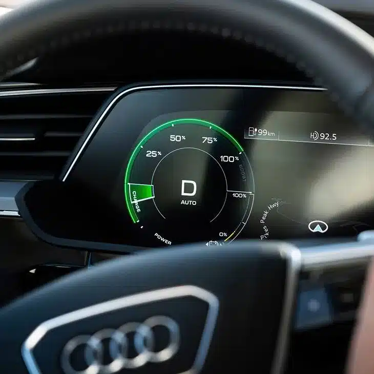 El automóvil eléctrico tiene muchos nombres como carro eléctrico, auto eléctrico, totalmente eléctrico o carro puramente eléctrico. En Audi encontrará el nombre e-tron en todos los modelos de automóviles nuevos con propulsión puramente eléctrica. En inglés, los vehículos totalmente eléctricos se resumen bajo el término “Battery Electric Vehicle”, abreviado BEV. Por un lado, la batería del automovil eléctrico se puede cargar a través de fuentes externas, como estaciones de carga o un wallbox; por otro lado, también existe la recuperación de energía durante la conducción.