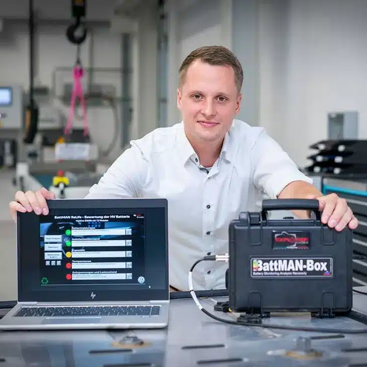 El automóvil eléctrico ya no funciona, pero ¿qué pasa con la batería? Desde principios de 2021, Volkswagen Group Components opera una planta piloto para el reciclaje de baterías en Salzgitter. Con la ayuda del software de análisis BattMAN ReLife, una batería se somete a una verificación rápida durante unos minutos antes de tomar una decisión sobre cómo proceder, dependiendo del estado de la batería.