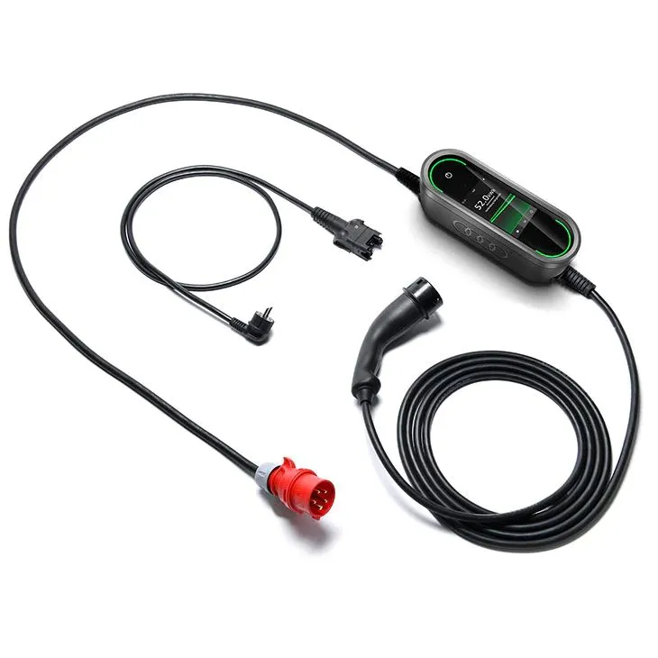 Una unidad de control que incluye un cable de conexión para el vehículo y dos cables de conexión a la alimentación, uno con enchufe doméstico y otro con enchufe industrial.